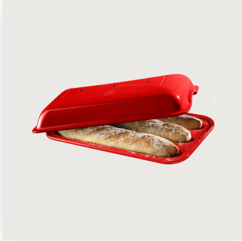 Discover the pleasure of baking your own baguettes, crusty and full of flavour ! Easy to use, you just place the dough in the holes, cover with the lid and put the mold in the oven. Thanks to the ribs, the dough will not stick, and the lid creates the right level of humidity for baking delicious baguettes. The holes in the lid allow the carbon dioxide to escape during cooking, creating a thin, crispy crust so special to French baguettes. The mold can be cleaned in the dishwasher. Recipe book included. All Emile Henry products are made in France and offer a ten years guarantee.