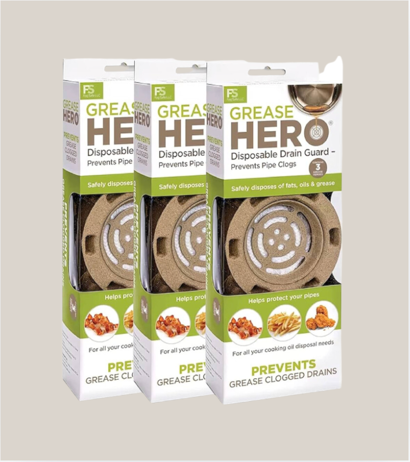 Grease Hero PLUS stores and effectively eliminates unpleasant odors. Once filled, the Grease Hero drain guard is easily disposed of in the trash. Made from recycled materials, the dishwasher-safe bowl and lid storage system