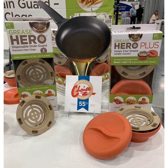 Grease Hero PLUS storage system is designed to hold your Grease Hero drain guards. Simply put the Grease Hero PLUS on your counter top and pour the oil directly from the pan into the center of the Grease Hero.